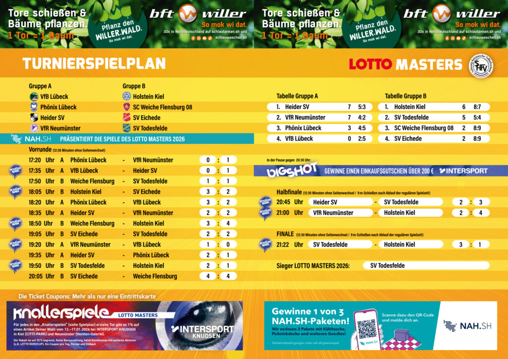 Vorjahressieger FC Kilia Kiel sowie der Nachwuchs der Kieler Störche mussten beim 25. LOTTO MASTERS bereits in der Vorrunde die Segel streichen. Rekordsieger Holstein (sechs Titel) wartet damit nun schon seit 2013 auf den siebten Turniersieg. Drittliga-Absteiger VfB Lübeck rehabilitierte sich indes für zahlreiche Minusleistungen der vergangenen Jahre, schickte eine mit zahlreichen Profis gespickte Mannschaft ins Rennen und schaffte mit drei Siegen souverän den Halbfinal-Einzug. Bereits im ersten Spiel der Gruppe A hatten die Lübecker mit dem 2:1 gegen die Störche einen prestigeträchtigen Erfolg landen können. Neben dem VfB schaffte der fünfmalige MASTERS-Sieger aus Weiche den Halbfinal-Einzug. In der Gruppe B hatten der 1. FC Phönix und Todesfelde die Nase vorn. Doch im Halbfinale kam für die beiden durchaus überzeugenden Lübecker Vertreter das Aus. Im Finale hatte dann letztlich der SV Todesfelde das entscheidende Quäntchen Glück auf seiner Seite.